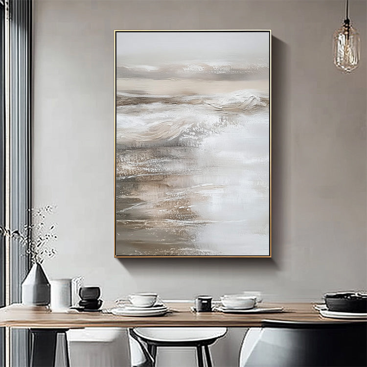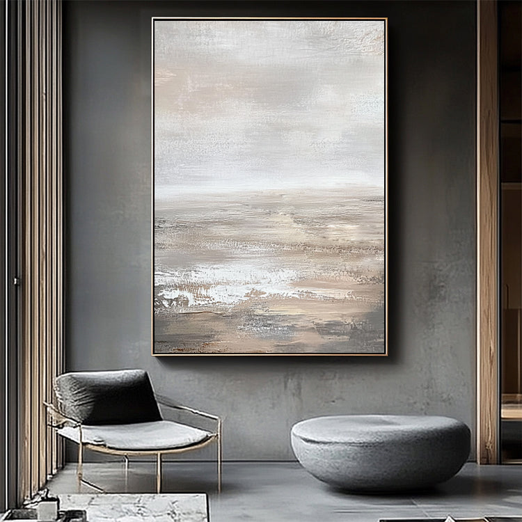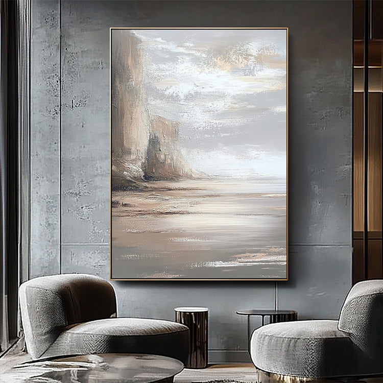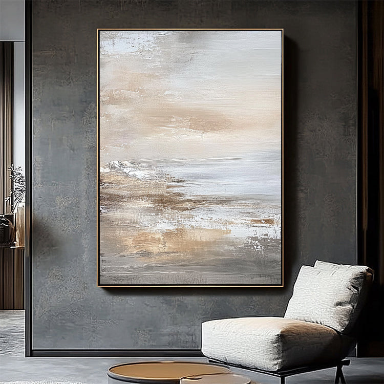 Ruhiges abstraktes Küstengemälde in warmen Beige- und Grautönen. Handgemalt mit Spachtel-Technik.