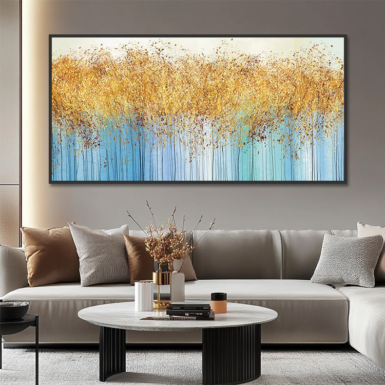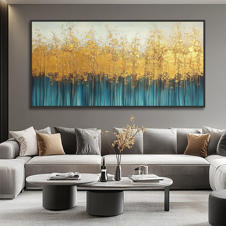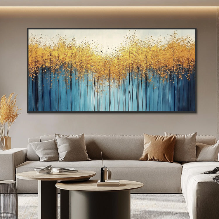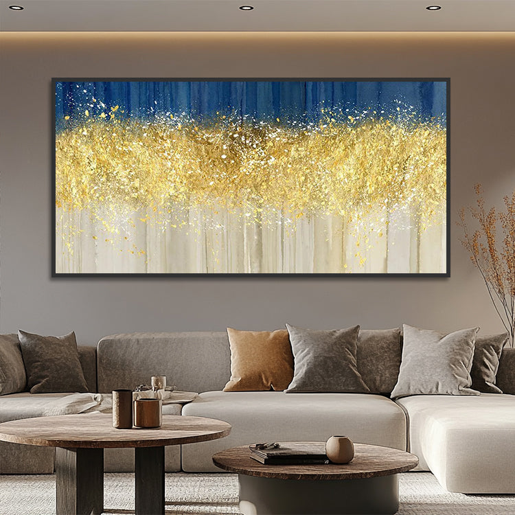 Luxuriöses Panorama-Gemälde mit Goldfolien-Elementen über tiefblauem Hintergrund. Handgemalt auf Leinwand.