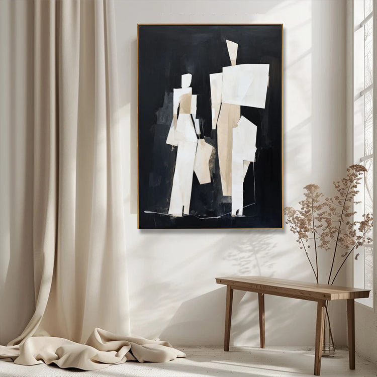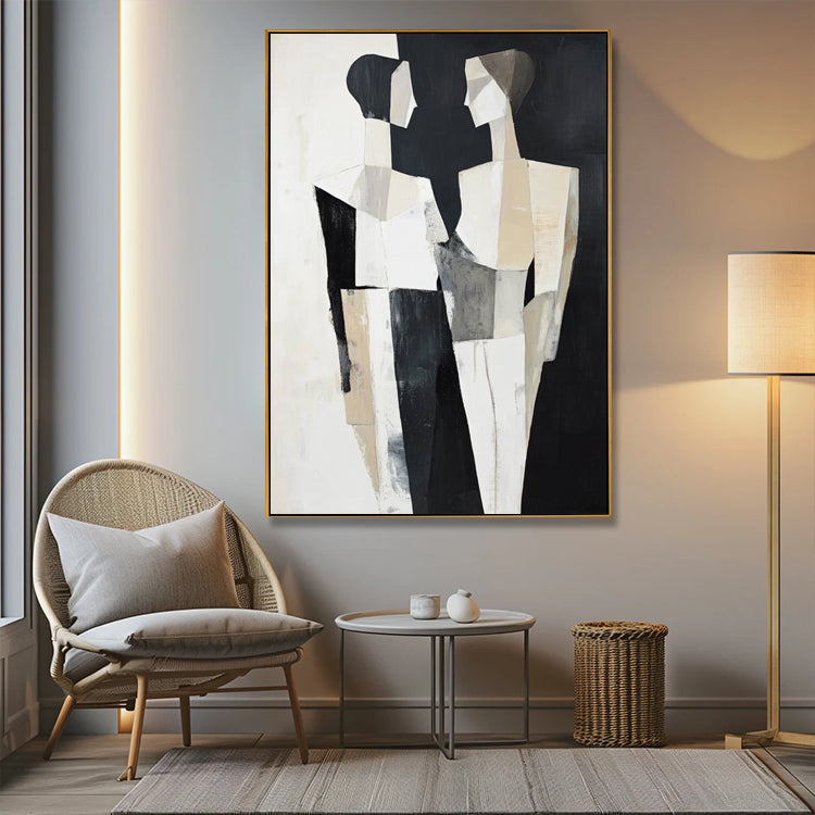 Faszinierendes kubistisches Gemälde zweier Figuren in Beige, Schwarz und Grau. Handgemalt auf Leinwand.