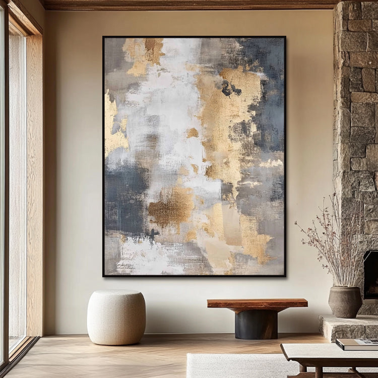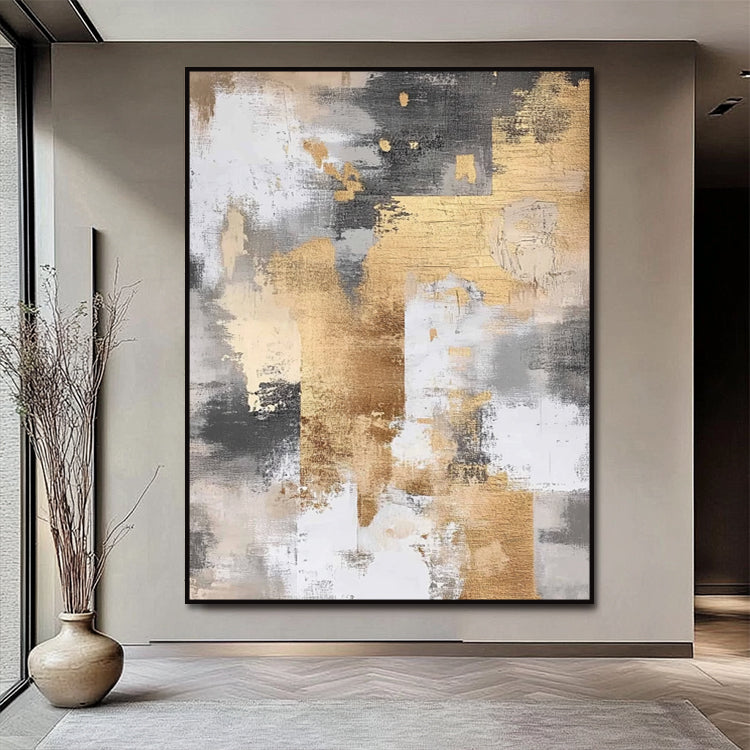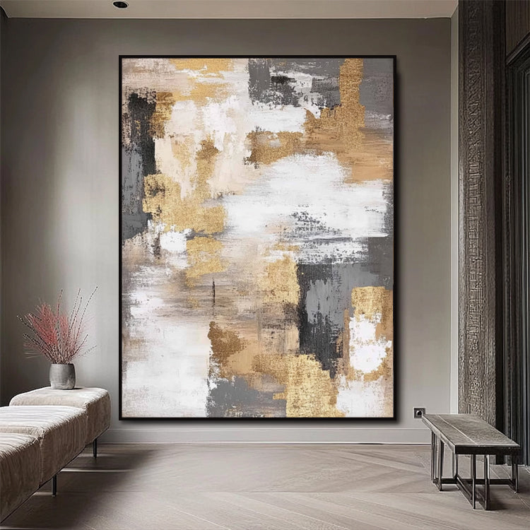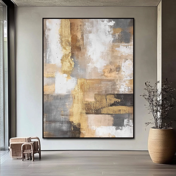 Abstraktes Wandbild in Gold, Beige und Grau mit luxuriösem Pinselstrich. Handgemalt auf Leinwand.