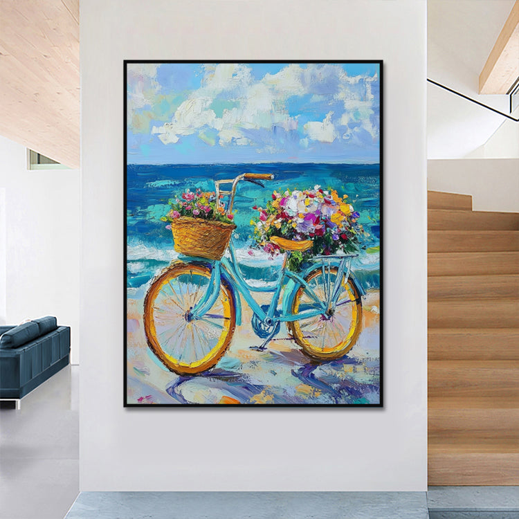 Romantisches Gemälde mit rotem Fahrrad und Blumenkorb am Strand. Handgemalt auf Leinwand.