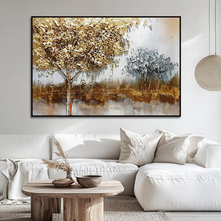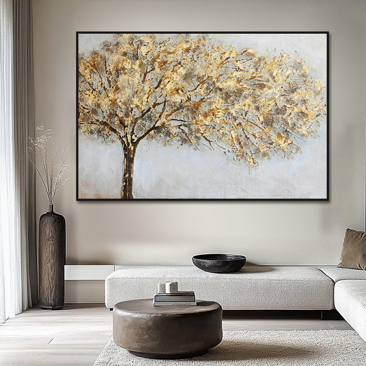 Elegantes Panorama-Gemälde mit goldenem Baum in strahlendem Goldton. Handgemalt mit Premium-Acrylfarben auf Leinwand.