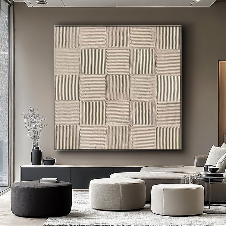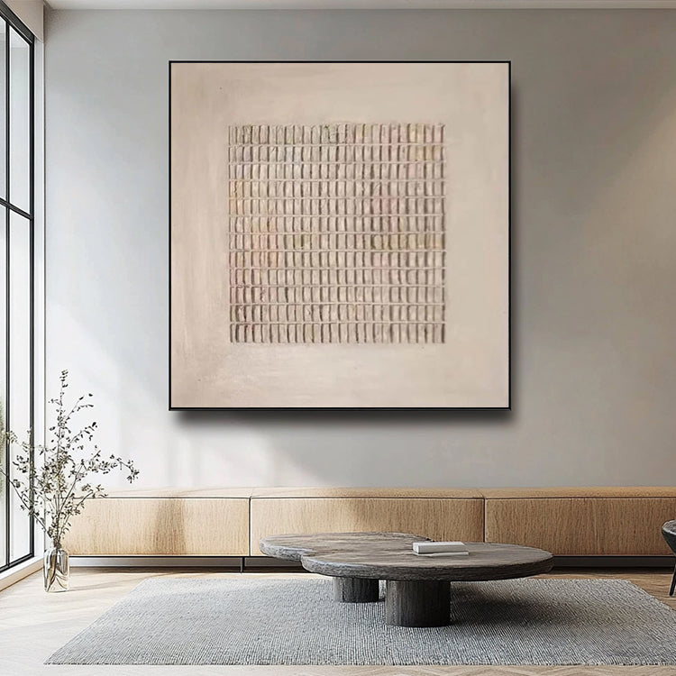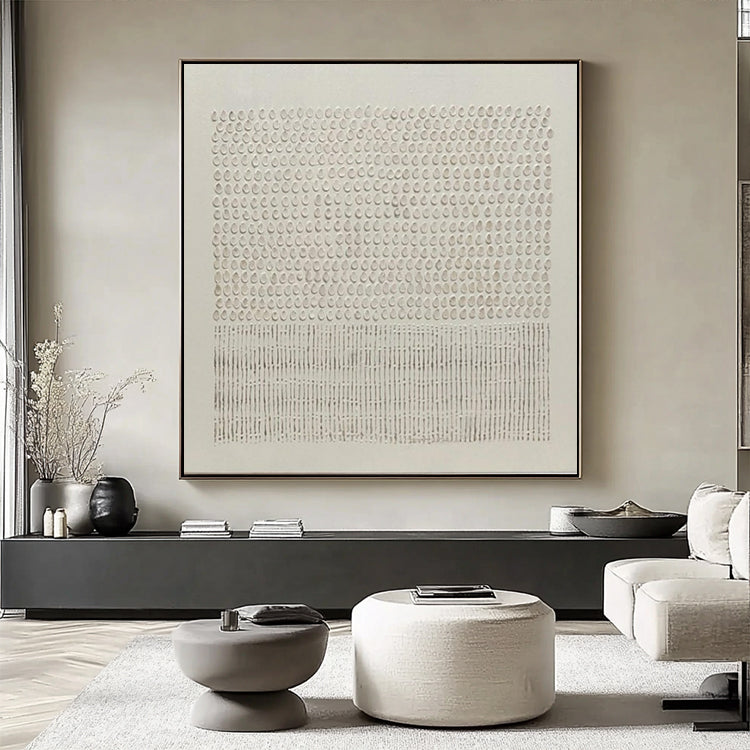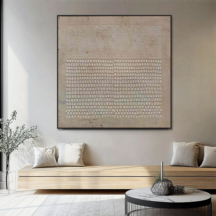 Zartes minimalistisches Wandbild mit Punktstruktur in warmen Beigetönen. Handgemalt mit feiner Spachtel-Technik.