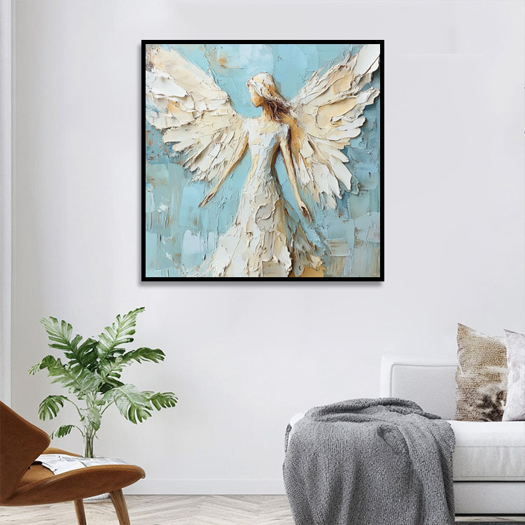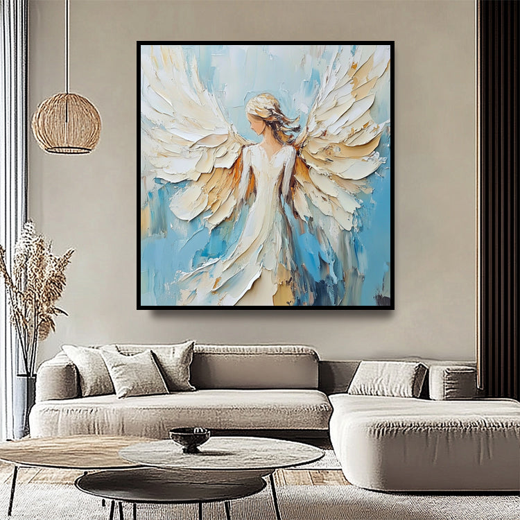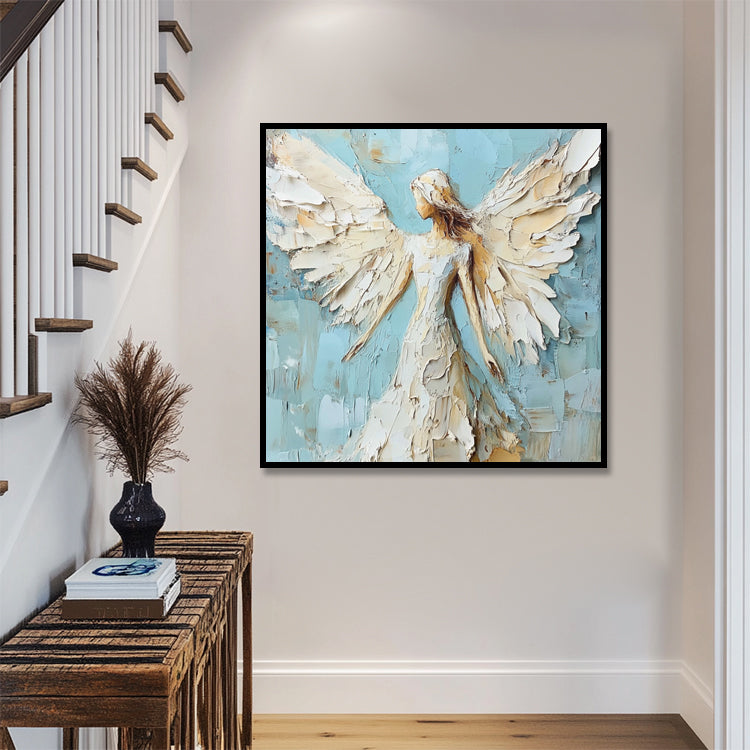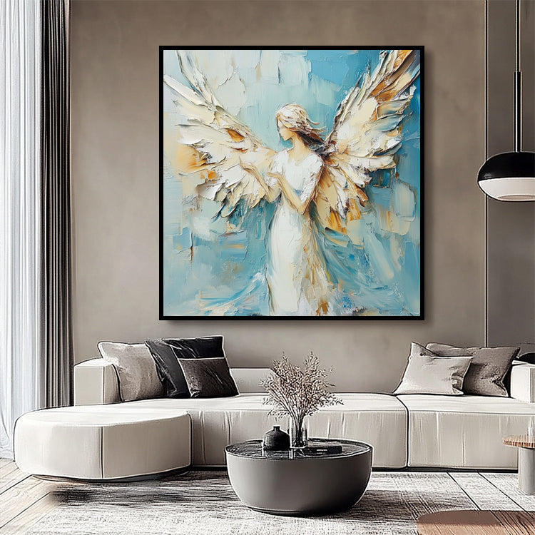 Spirituelles Engelsgemälde mit ausgebreiteten Flügeln in Weiss, Blau und Gold. Handgemalt auf Leinwand.