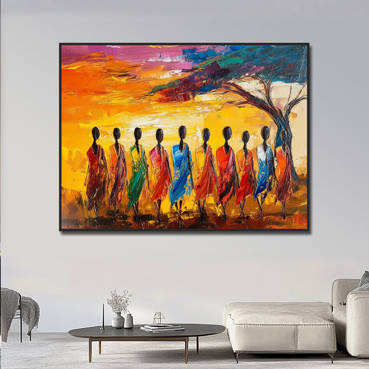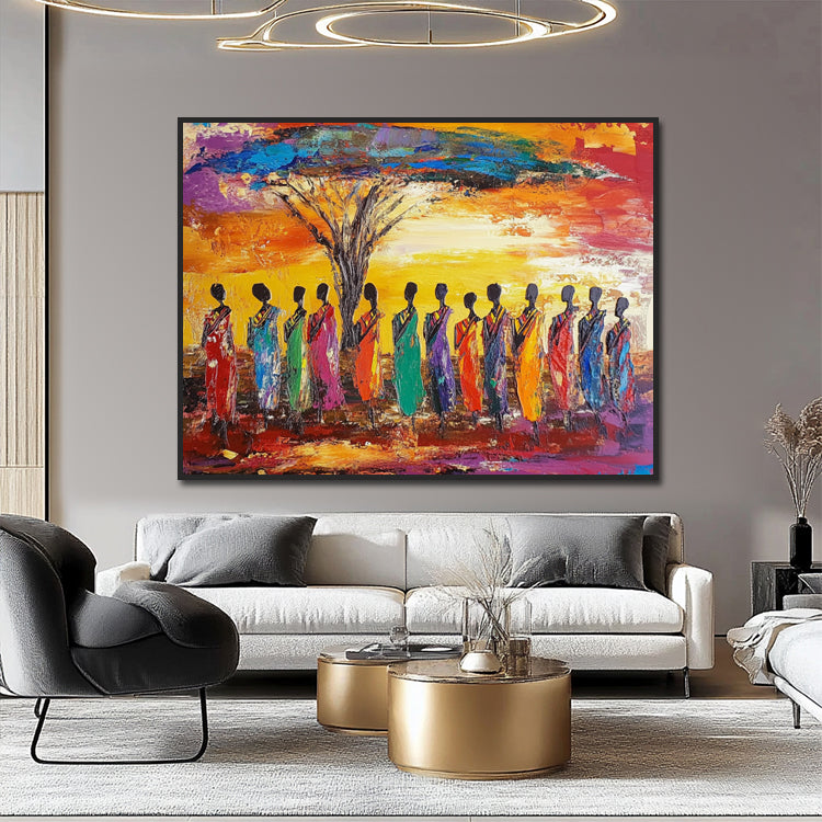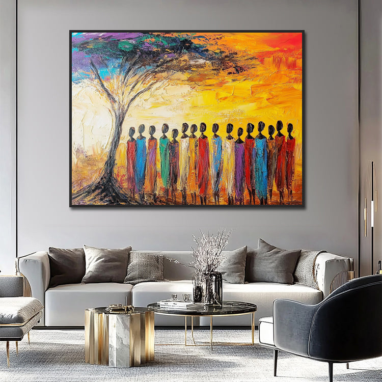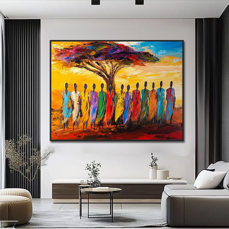 Farbenprächtiges Gemälde von Stammesmitgliedern unter einem Akazienbaum. Handgemalt auf Leinwand.
