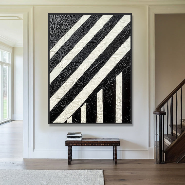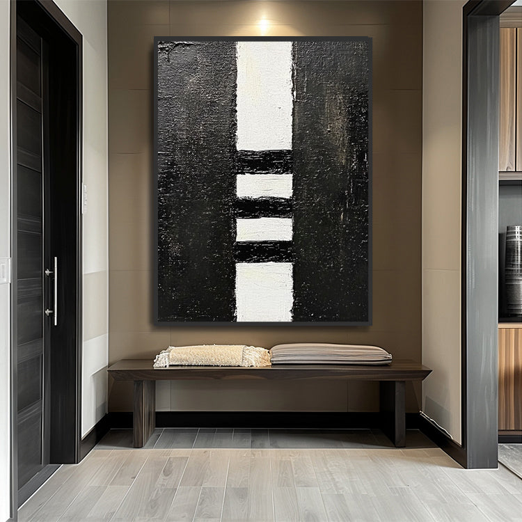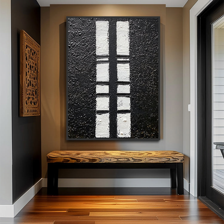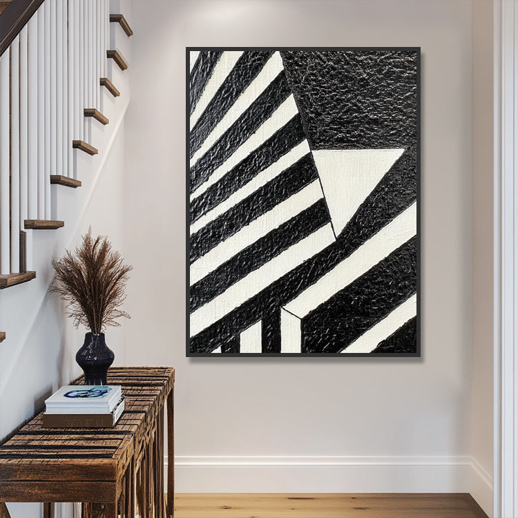 Kraftvolles geometrisches Wandbild in Schwarz-Weiss mit 3D-Spachtelstruktur. Handgemalt auf Leinwand.