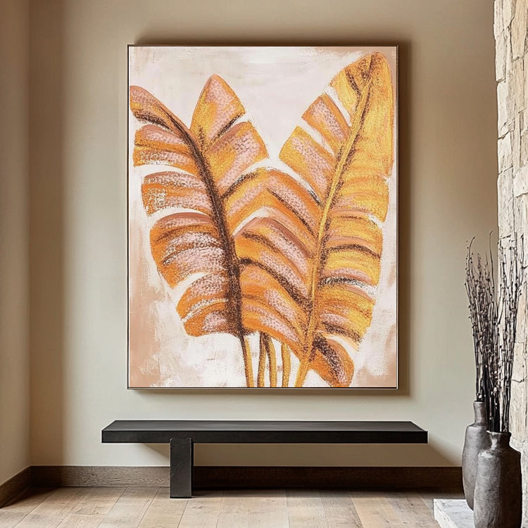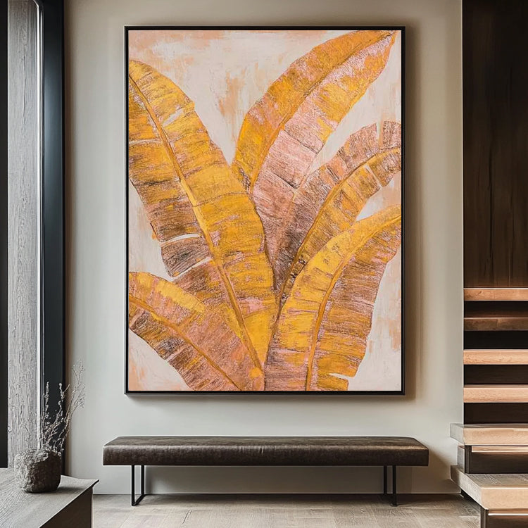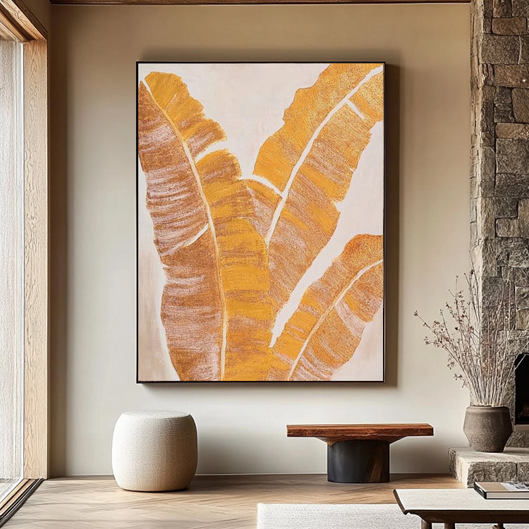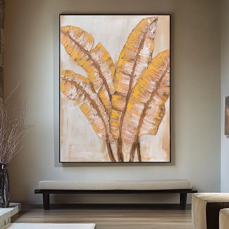 Elegantes Gemälde mit goldenen Bananenblättern auf hellem Hintergrund. Handgemalt auf Leinwand.